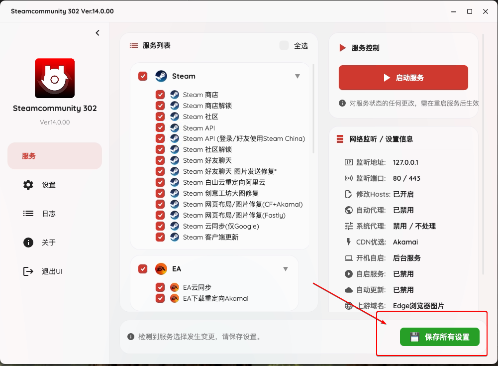 - 已知BUG:点击启动服务后无反应: 设置页也随意改动后保存下设置即可