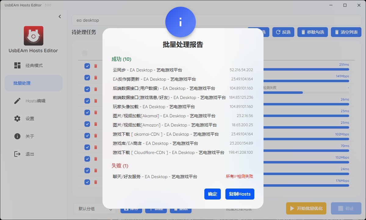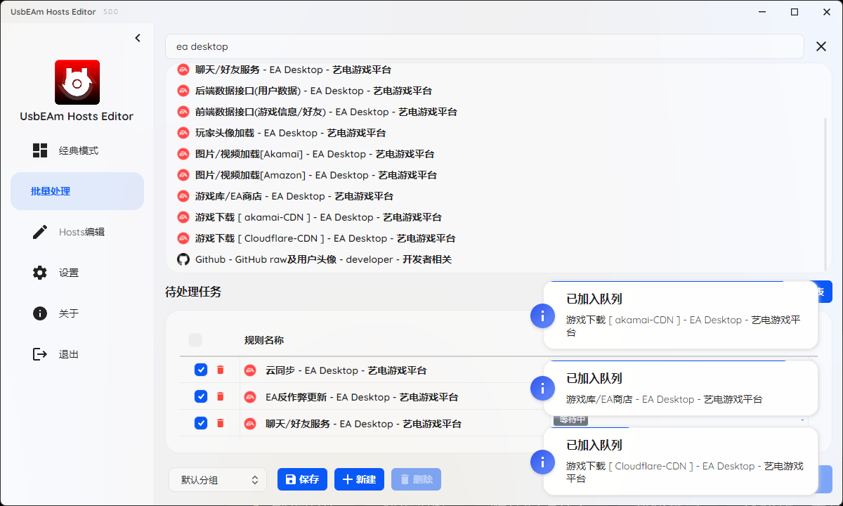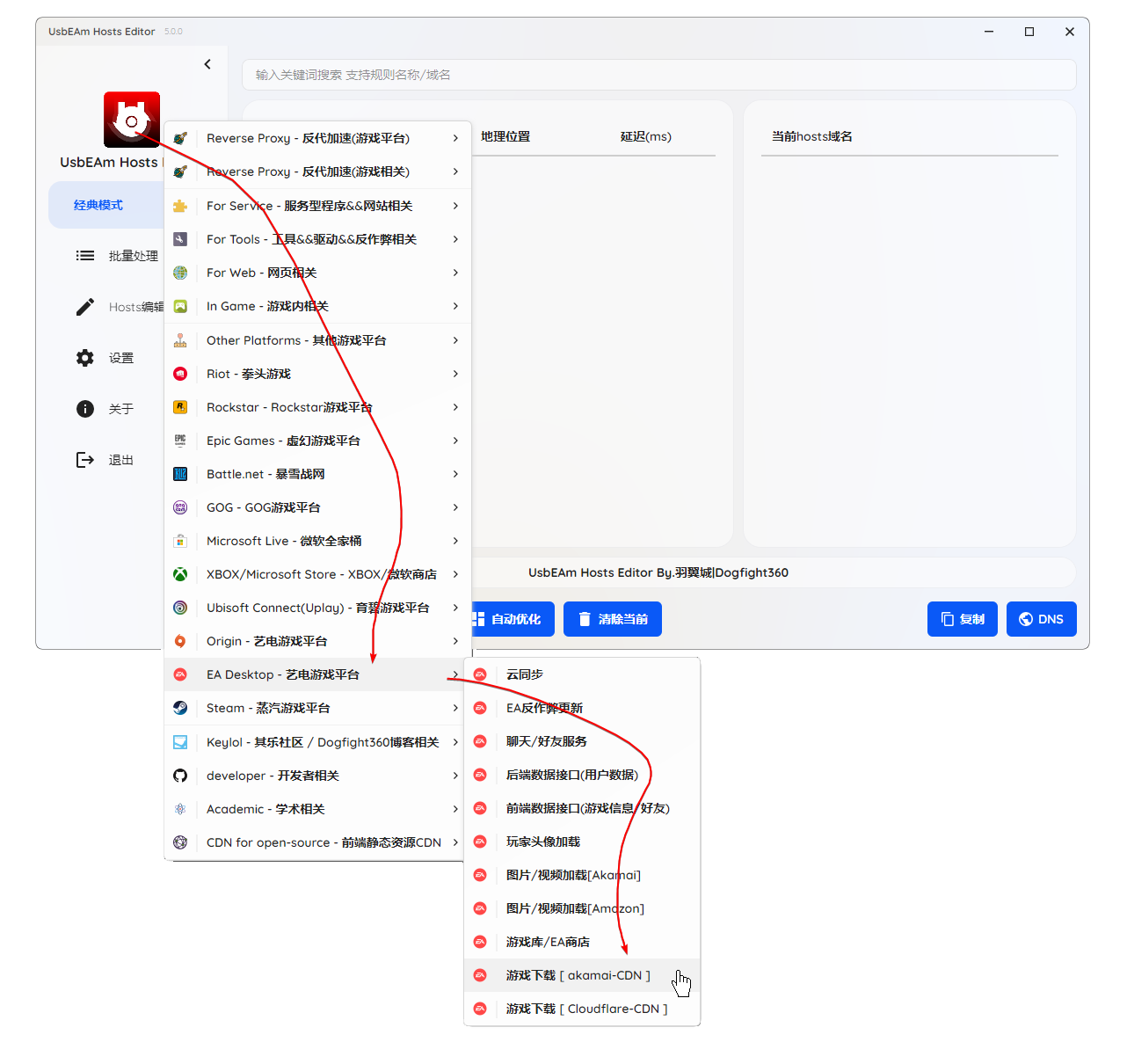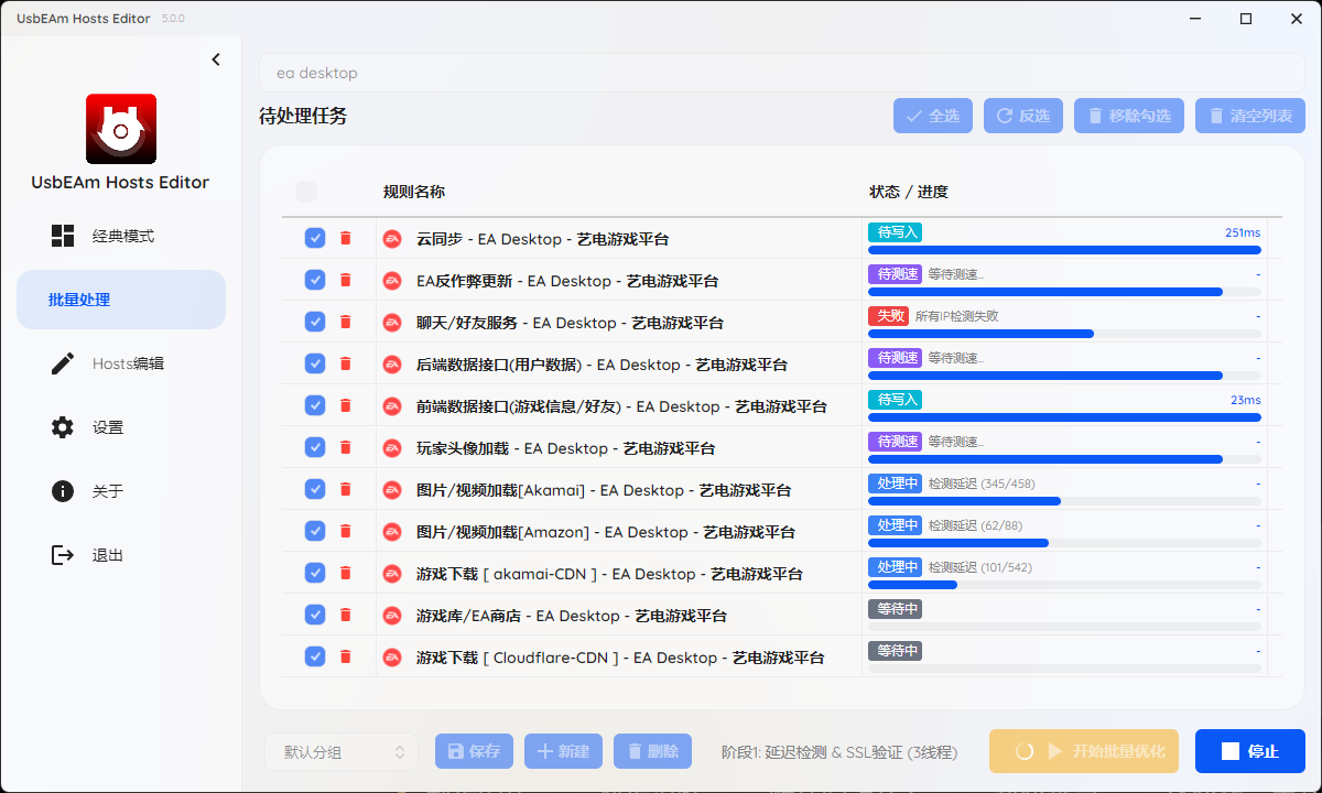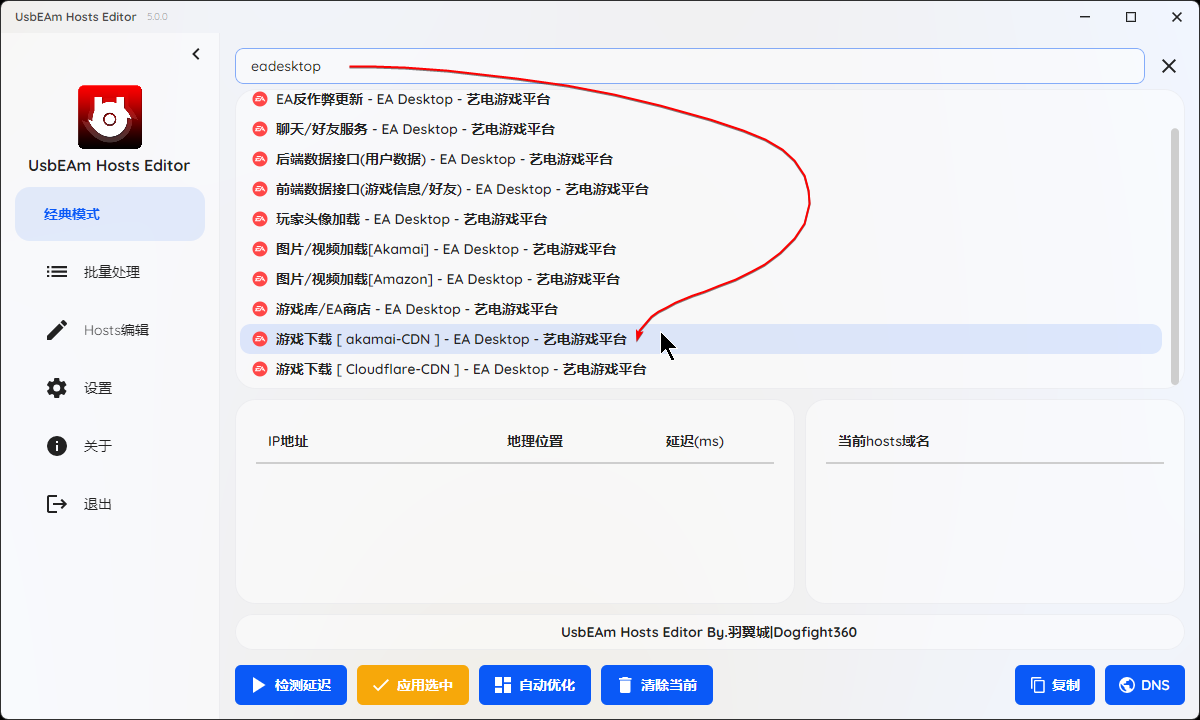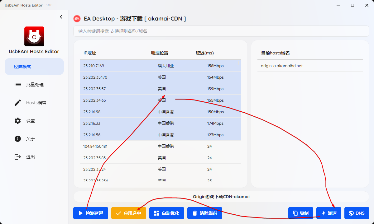 下面使用”经典模式”以EA DESKTOP访问/下载过慢,选择对应规则,检测延迟,选择一个IP并应用为例